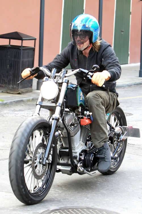 In sella alla sua moto a New Orleans abbiamo beccato Brad Pitt con indosso un paio di pantaloni Trooper J Brand in colore oliva-vintage.