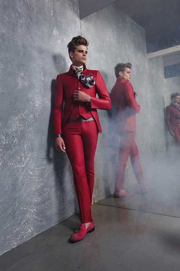 Un abito dalla linea slanciata abbinato al gilet dal taglio fashion, pantalone e bretelle realizzate nel nostro raso di lana (60%) e seta (40%) di uno dei colori pantone più di tendenza ovvero il “rumba red”.