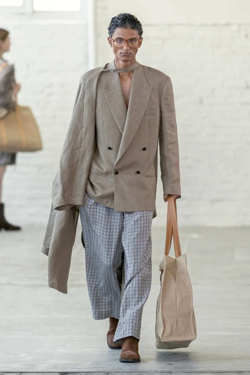 Lo stile sartoriale classico resta un caposaldo, ma con reinterpretazioni fresche e audaci. I completi tradizionali – come quelli visti nelle collezioni di Hed Mayner – sono stati esplorati con nuove proporzioni, spalle morbide, dettagli destrutturati e superfici tessili che giocano con texture e lucentezze.